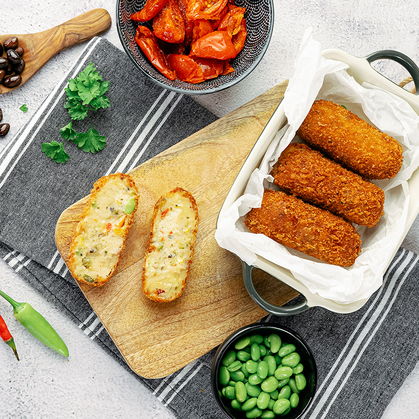 De vegetarische groente (mini) croquetten/bitterballen hebben een kenmerkende Holtkamp Horeca signatuur. De basis is verse groenten, vegetarische binding en het krokante korstje.