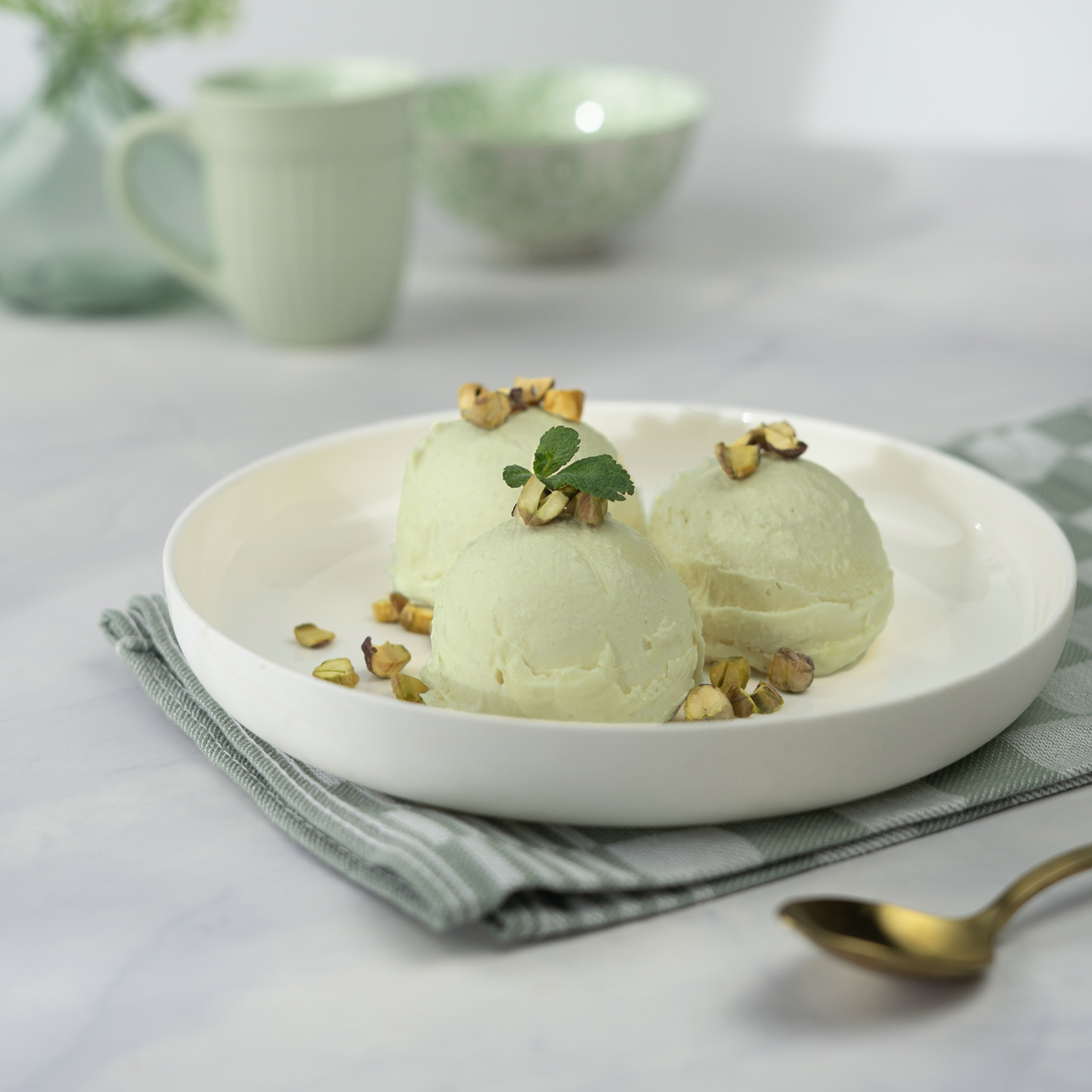 Lactosevrije gelato vervaardigd met uitsluitend plantaardige ingrediënten. Bereid met vers gebrande pistache noten.