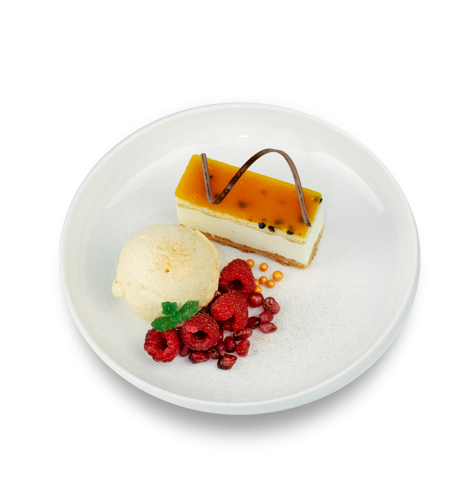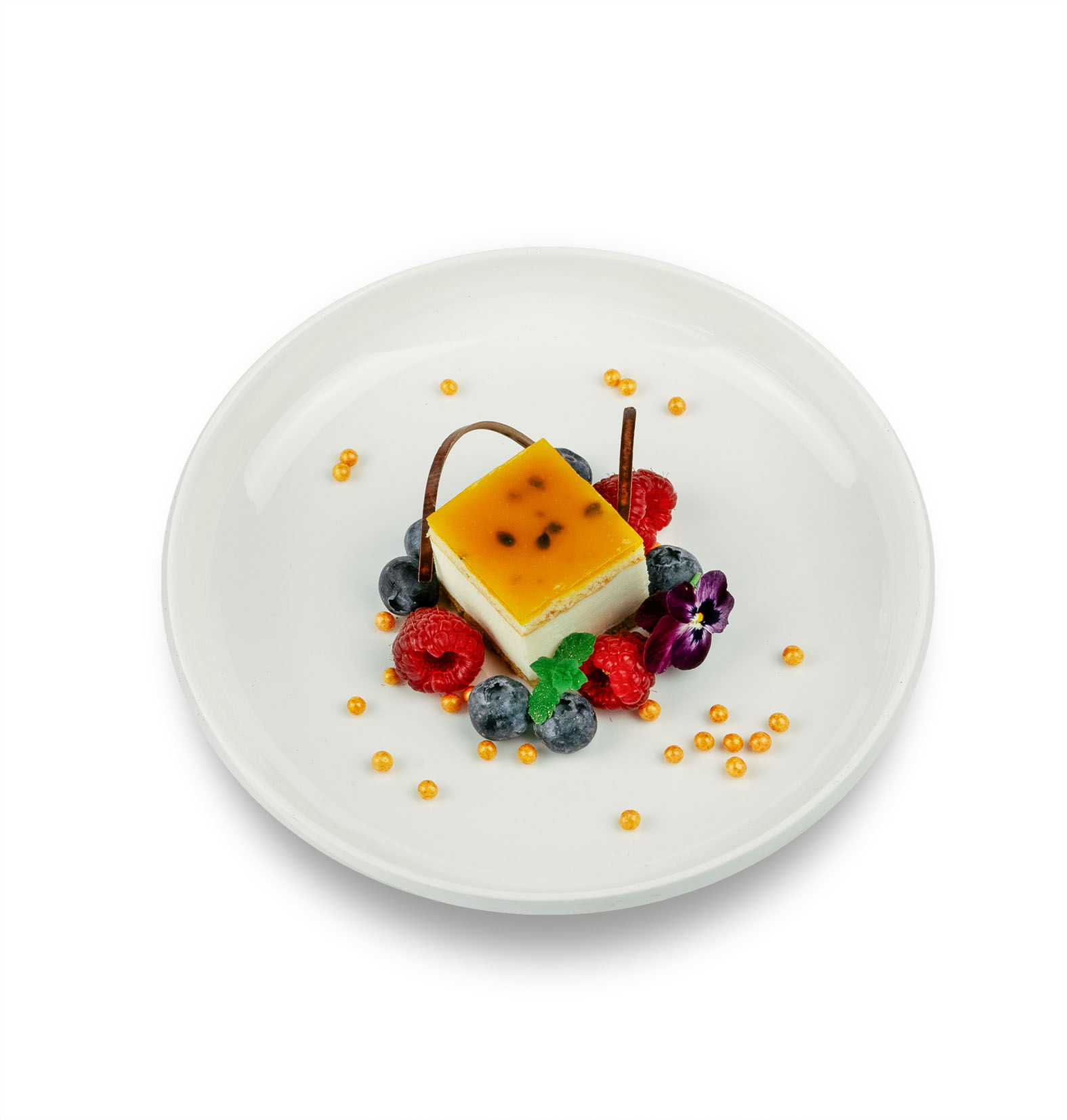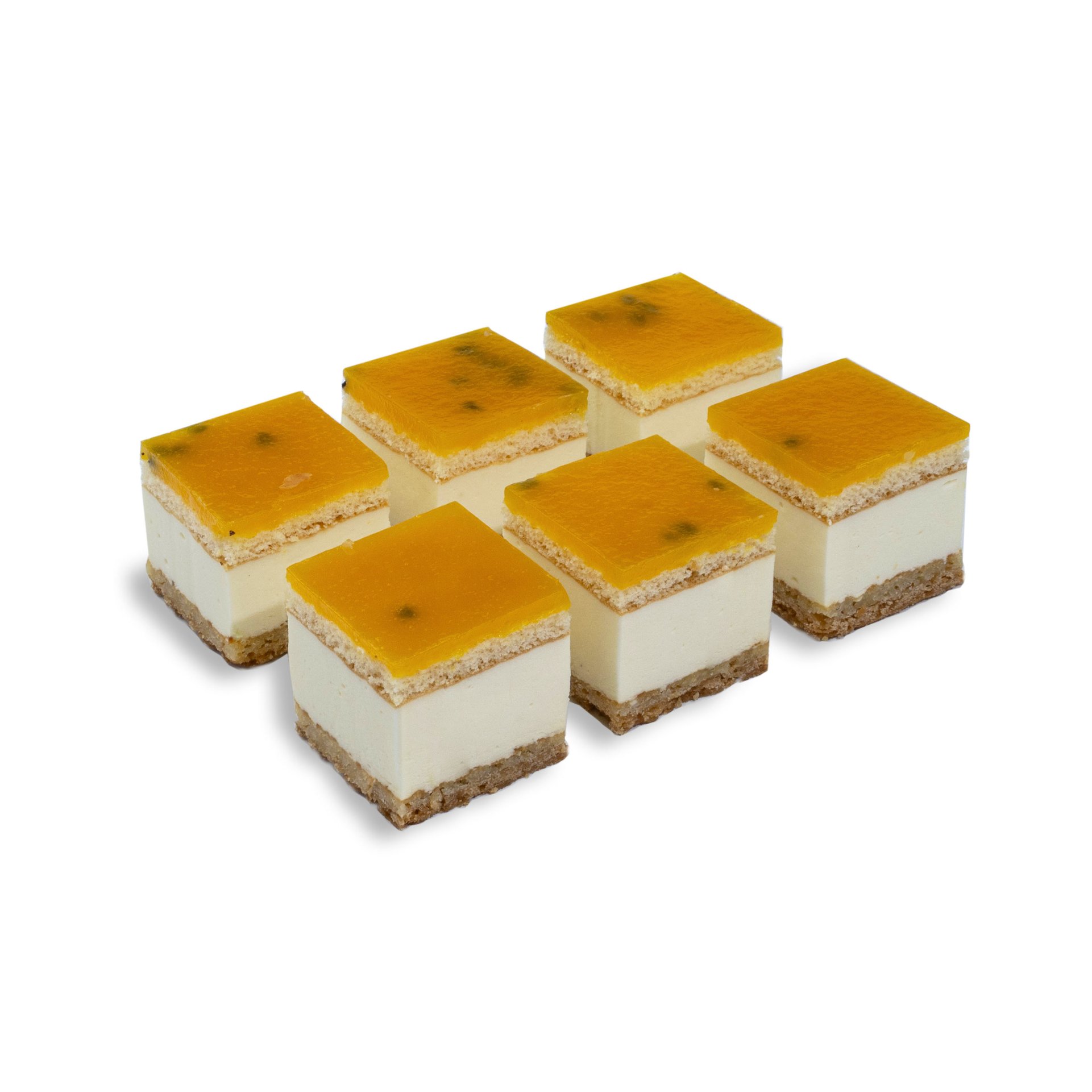 Koekbodem met frangipane. Daarop een luchtige witte chocolade bavaroise. Gedecoreerd met spiegel van hele passievruchten met een vleugje mango puree.