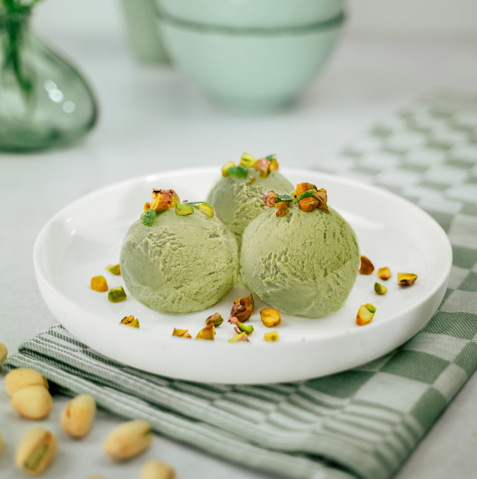 Lange tijd op lage temperatuur gebakken pistache nootjes tot pâte gewreven en meegetrokken in een romige compositie; na rijping tot ijs vervaardigd.
