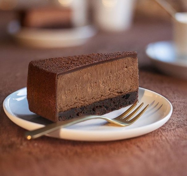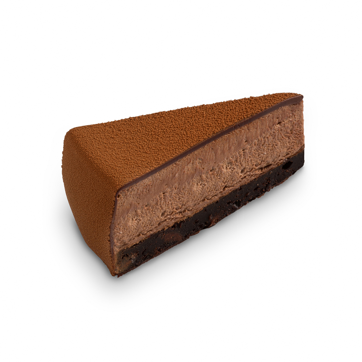 De bodem is gemaakt van malse brownie met pure chocolade, gevuld met een luchtige chocolade mousse. Het geheel is overgoten met ganache en fluweel afgespoten cacao.