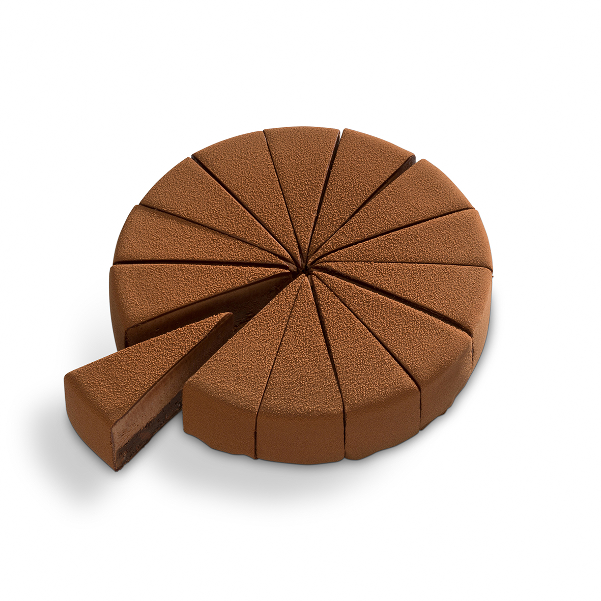 Gemaakt van malse brownie met pure chocolade, gevuld met een luchtige chocolademousse. Het geheel is overgoten met chocolade ganache en fluweel afgespoten met cacao.